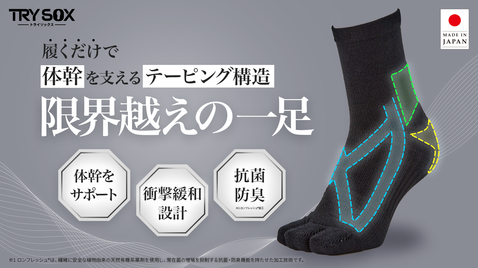 履くだけで体幹を支えるテーピング構造の靴下を足の専門家と共同開発。着圧、インソール設計で体幹をサポートするTRY SOXブランドをリリース